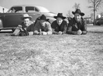 Cowhands from around the nation were in Fort Worth, Texas, for the gala opening of Southwestern Exposition and Fat Stock Show. They are, left to right, Hank Mills, Jackie Cooper, of Newhall, California, Mitch Owens, of Fresno, California, and Hugh Bennett, of Colorado Springs, Colorado. The four men are lying on their stomachs on the grass. They are wearing cowboy hats and western apparel. There is car behind them.
