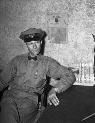 O. V. Peterson, originally from Denmark, wears a garage attendant's uniform and seated in a casual pose. He has concern about the European war effect on his adopted country, the United States. Published on May 13, 1940.