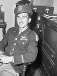 Captain T. J. Higgins Junior, son of Mr. and Mrs. T. J. Higgins, of Big Springs, Texas is in Fort Worth visiting relatives here for the first time since he went overseas in July 1942. Capt. Higgins was stationed in Guatemala and Panama before he joined General Chennault's Flying Dragons a year ago.. He also spent time in Africa and India. Although he was reported missing at one time, Capt. Higgins said that was erroneous. He was just about two weeks late in returning from a mission. He was forced down over Indo-China and in bailing out injured his knee when it struck the plane's tail. Capt. Higgins is wearing his military uniform and sitting in a chair. There are two storage cabinets behind him. Star-Telegram Morning March 19, 1944