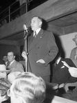 Texas governor Coke Stevenson at the microphone declaring opening of the Southwestern Exposition and Fat Stock Show. Governor Stevenson is wearing a pinstripe, double-breasted suit with a flag pin on the lapel. He has his left hand in his jacket pocket and the other around the microphone stand. There is a crowd of people sitting around the governor.