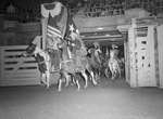 Shot of the grand entry at the Southwestern Exposition and Fat Stock Show. Leading the procession are Clyde Burk and Jesse Goodspeed, flag bearers, and behind them are Don Nesbitt, left, arena director, and Verne Elliott, rodeo manager. All four are riding horses into the rodeo arena.