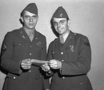 The first tickets to Southwestern Exposition and Fat Stock Show rodeo were donated to Frank C. Pruchnicki, of Lorraine, Ohio, and Fred K. Smith, of Paris, Kentucky, first-time visitors to Texas. They arrived in Fort Worth, Texas, en route to Camp Hood. The men are standing in front of a blank wall, both wearing their military uniforms. Smith is wearing eyeglasses. They are holding the rodeo tickets.