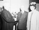 Reverend L. D. Anderson, pastor of First Christian Church and Mr. and Mrs. Herman Taylor are re-enacting a scene that took place at the church. On November 4, 1920, the pastor married the couple. Reverend Anderson is dressed in a suit. Mr. Taylor is now a deacon in the church. He is wearing a double breasted pinstripe suit. Mrs. Taylor is president of the Woman's Council. She is wearing a hat, dress, pearl necklace, and a coat.
