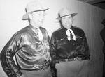 Rodeo officials from Ogden, Utah, William D. Wood, left, and Vernon J. Eldredge. The men were in Fort Worth, Texas, to attend the Southwestern Exposition and Fat Stock Show rodeo at Will Rogers Memorial Coliseum. Both men are wearing cowboy hats, western shirts, bandannas, and trousers.