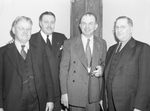 New officers of the Southwestern Milking Shorthorn Association elected Monday afternoon at Hotel Texas. Left to right, W. B. Joiner, Arlington, Texas, secretary; Paul Hamilton, Fort Worth, Texas, treasurer; R. E. Gracey of Roscoe, Texas, vice president and J. M. Axtell of Fort Worth, Texas, president. The four men are standing next to each other wearing suits. Mr. Joiner and Mr. Axtell are wearing glasses. Mr. Gracey has a cigar in his left hand. Star-Telegram Morning March 14, 1944