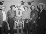 Champions of the 1943 rodeo who received awards from the National Rodeo Association. They are, left to right, Amye Gamblin, Andy Curtis, Scott D. Hamilton, Louis Brooks, Everett Shaw, and Fuzzy Garner. Mr. Gamblin, of Wilson, Oklahoma, won the calf roping title. He is wearing a cowboy hat, a coat, jeans, and a belt buckle. Mr. Curtis, of El Reno, Oklahoma, won the title in saddle bronc riding. He is wearing a dark-colored cowboy hat, a western shirt, and trousers. Mr. Hamilton, the retiring National Rodeo Association president, is holding the prize saddle. He is wearing a cowboy hat and a tie. Mr. Brooks, from Pittsburg, Oklahoma, is the all-around cowboy champion and also bareback bronc riding champion. He is wearing a cowboy hat, western shirt, jeans and a belt buckle. Mr. Shaw, of Stonewall, Oklahoma, won single steer roping. He is wearing a cowboy hat and a leather coat. Mr. Garner, of Canute, Oklahoma, won the bull riding title. He is wearing a cowboy hat and a dark-colored suit.