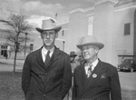 Frank Newsom, Mason County agent, left, who supervised the feeding champion at the Fat Stock Show Rodeo, and H. A. Fitzsimons, of San Antonio, Texas, breeder of champion steer. Mr. Newsom is wearing a hat, a collared shirt, a necktie and coat. Mr. Fitzsimons is wearing a hat and a double breasted, pinstripe suit. He has a button on his lapel promoting the Southwestern Exposition and Fat Stock Show. The men are standing outside of the Will Rogers Memorial Coliseum. There are parked cars behind them.