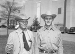 Marvin Kothmann, left, Mason County rancher, and his son, Mayfield Kothmann. Marvin Kothmann is wearing a collared shirt and necktie, a coat, eyeglasses and a cowboy hat. He has an eyeglasses case in his shirt pocket. Mayfield is wearing a cowboy hat, eyeglasses, trousers, a button-up shirt and trousers. The men are standing outside Will Rogers Memorial Coliseum. There are parked cars behind them.