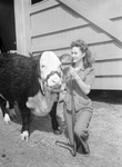 Merlyn Gail Kothmann, 17, of Mason County, Texas, shown with her grand champion steer at the Southwestern Exposition and Fat Stock Show. Miss Kothmann is wearing a collared blouse and trousers. She is kneeling next to her 13-month-old Hereford steer.