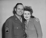 Technical Sergeant Gene Autry, of the Army Air Forces, in attendance at the Southwestern Exposition and Fat Stock Show with an unidentified young woman. He is standing in front of a blank wall, wearing his military uniform. The woman is wearing a coat.