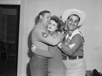 Technical Sergeant Gene Autry, left, and Abe Lefton, radio announcer, right, at the Southwestern Exposition and Fat Stock Show. Autry is hugging an unidentified woman who is standing between him and Lefton. Autry is wearing his military uniform. The woman is wearing a blazer and skirt. Lefton is wearing a cowboy hat, a western shirt, and trousers.