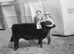 Howard Clifton Preslar, 13, right, and county agent R. L. Merz Junior shown with the Aberdeen-Angus reserve champion steer of the Boys' Show at the Southwestern Exposition and Fat Stock Show. They are standing outside in front of a tent with the steer. Merz is wearing a hat, collared shirt, necktie and a leather jacket. Howard is wearing a hat, collared shirt and trousers.