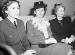 Spectators at the Southwestern Exposition and Fat Stock Show, left to right, flight officer Joanna Everard, of the Royal Air Force, Mrs. Ray Crowder and Mrs. W. A. Michero. Miss Everard is wearing her military uniform. Mrs. Crowder is wearing a hat, a checked blazer and skirt, and gloves. Mrs. Michero is wearing a dark-colored blazer and a dress.