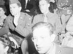 Spectators at the Southwestern Exposition and Fat Stock Show, left to right, Sergeant John Harvey, of Roanoke, Virginia, and Sergeant Tom Nevins, of New York. The sergeants, visiting from Army Air Forces Training Command, are wearing their military uniforms. They are sitting in the crowd with other spectators.