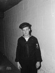 John Penton, of Algona, Iowa, second class aviation machinist mate, at the Southwestern Exposition and Fat Stock Show. Penton is wearing his Navy uniform and standing in front of a brick wall.
