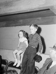 Mary Griffith and Bill Griffith, children of Mr. and Mrs. Bert Griffith, of Smithfield, Texas, attending the Southwestern Exposition and Fat Stock Show. Mary is wearing a pinafore dress. Bill is wearing a striped, collared shirt and trousers. They are sitting on a rail behind the seating area as they watch the rodeo. An unidentified man sitting in the crowd is looking up at the children, at right.