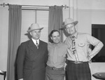 Earl T. McMillian, of Houston, Texas, Technical Sergeant Gene Autry, and W. A. Lee (left to right) attending the Southwestern Exposition and Fat Stock Show rodeo. Autry is wearing his military uniform. McMillian is wearing a pinstripe, double-breasted suit and a hat. Lee is wearing a collared shirt, necktie, trousers and a hat. There is a window covered with drapes behind the three men.
