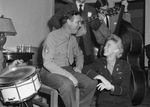 Technical Sergeant Gene Autry with Lieutenant Mary Chane, of Dallas, Texas, attending the Southwestern Exposition and Fat Stock Show. Autry is sitting in a chair, listening to the musicians. Lieutenant Chane is posing on the floor next to Autry. There is a drummer in the foreground (partially obscured), and a guitarist and a man playing a double bass in the background. Autry and Lieutenant Chane are both wearing their military uniforms.
