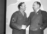 Technical Sergeant Gene Autry, left, shaking hands with Earl T. McMillian, of Houston, Texas, at the Southwestern Exposition and Fat Stock Show. They are standing in front of a blank wall. Autry is wearing his military uniform. McMillian is wearing a pinstripe, double-breasted suit. His left hand is in his jacket pocket.