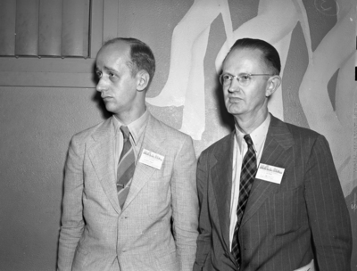The Texas Philatelic Association is holding their 44th annual convention at the Blackstone Hotel. Attending the convention, left to right, are H. L. Nichols and Dr. J. L. Whitman. Mr. Nichols, of Houston, Texas, is wearing a light colored suit. Dr. Whitman, of Fort Worth, Texas, is wearing a pinstripe suit.