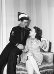Perry Brown McCord Junior and his wife, the former Miss Juanita Cook. They were married the week McCord Junior came back from two and half years of service. Mr. McCord Junior is wearing a Navy uniform and his wife Mrs. McCord Junior is wearing a buttoned up coat with a flower accessory near her left shoulder. She is sitting in a chair and Mr. McCord Junior is sitting the arm rest of the chair. They are both smiling at each other and holding each other's hand.