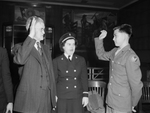 Private Joe You Sing, Chinese soldier in U. S. Army, right, Federal Judge James C. Wilson and Ensign Bernice Weik of the Navy. The judge is granting Private Sing United States citizenship. Judge Wilson and Private Sing are holding their right hands up for the ceremony. Ensign Weik is standing between the two men witnessing the event. Star-Telegram March 16, 1944