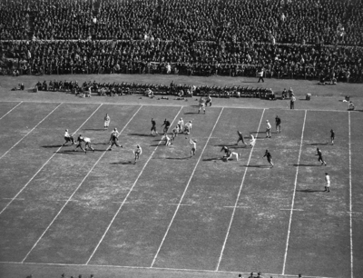The undefeated Texas A&M Aggies are facing off against the Tulane Green Waves in the 1940 Sugar Bowl. The game is being held in front of a crowd of 73,000 at Tulane Stadium. The photograph shows the progression of a six yard pass from Aggie quarterback, number 45 Walemon Price, to Derace Moser, number 42. The Aggies went on to win the game 14-13 after two rushing touchdowns from fullback, John Kimbrough. With a perfect 11-0 season, the Texas A&M Aggies were named National Champions.