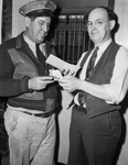 When Odis L. Wilson, honorably discharged form the United States Army Air Forces (USAAF), got his second mustering-out pay check, he hurried to a window at the post office and bought four war bonds from clerk R. L. Lawing. Mr. Wilson is hat and a jacket. He's being handed a paper bond. Mr. Lawing is wearing a vest and tie. He's holding paper bonds in his right hand and handing Mr. Wilson a bond with his left hand. Star-Telegram Morning March 17, 1944