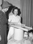 Mrs. J. E. Cavender, left, watches Mrs. Georgia Faqua, emergency war food assistant , shred cabbage into a stone jar in a kraut-making demonstration held at the Elks Club. Image appeared in the Star-Telegram Morning Edition, March 20, 1944.
