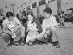 Fort Worth, Texas, school children observed their "special day" on the grounds of the Southwestern Exposition and Fat Stock Show. Left to right, Larry Joe Rich, Doris Jan Reinhardt and Morris Reinhardt are crouching on the ground, holding the prizes they won at the show. Larry Joe is wearing a button-up shirt with the sleeves rolled up and striped trousers. He is holding a doll and smiling. Doris Jane is wearing a striped dress and a coat over her shoulders. She is holding three dolls. Morris is wearing a toboggan, button-up shirt, and trousers. There are other children and adults standing in the background.