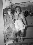 Fort Worth, Texas, school children observed their "special day" on the grounds of the Southwestern Exposition and Fat Stock Show. Jimmy McVey and Bobbe Moore are sitting on a railing and eating cotton candy. Jimmy is wearing a collared shirt and trousers. Bobbe is wearing a button-up shirt, vest, skirt, and cowboy boots. Her cowboy hat is hanging on a string around her neck.