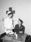 Mrs. Lucille Bordeaux, nurse at Red Cross Blood Donor Center, serving refreshments to Major Lorraine F. Armstrong. A nurse bringing refreshments to a table where a man who just donated blood sits.