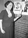 Mrs. C. U. Kane looking at her son's medal. A woman standing near a fire place looking at her son's medal. There is a photograph and statue on the mantel.