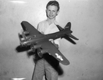 David Baker, 18, son of Mrs. J. G. Baker, shown standing against a wall holding a model airplane. Baker built the B-17 model in wood-working class at Technical High School. Image appeared in the Star-Telegram Evening Edition, March 21, 1944.