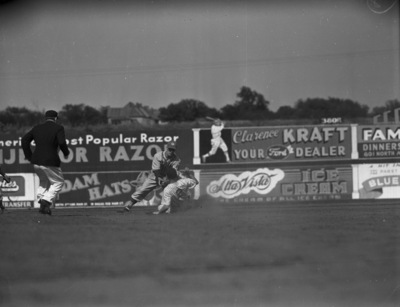 The Fort Worth Cats hosted a series against the Oklahoma City Indians at LaGrave Field. The Cats second baseman, Clyde "Rabbit" McDowell, number 2, is sliding feet first into second on a steal. The Indians' second baseman, Joe Gedzius is applying the tag too late.