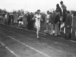 Dewey Shilling, of Technical High School, of Fort Worth, shown winning the high school mile race at the Fat Stock Show track meet. Behind him, in second place, is Charles Little, of Abilene, Texas. Spectators are standing to the side of the track, at right, watching the runners cross the finish line.