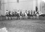 Riders who participate in the mounted square dance, or quadrille, a feature of the Southwestern Exposition and Fat Stock Show in Will Rogers Memorial Coliseum. They are, left to right, Bernice Dossey, Dick Griffith, Polly Drayer, Carl Dossey, Effie Corbin, Hank Mills, Mary Iler, Hoyt Hefner, Tad Lucas, Bill Iler, Mitzy Lucas and Don Wilcox. The twelve riders are mounted on their horses. The riders are dressed in cowboy hats and western wear. They are in front of the Will Rogers Memorial Coliseum. There is an emergency vehicle parked behind them at the far right.
