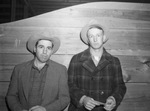 Attendees at the Southwestern Exposition and Fat Stock Show included Bill McGuire and Sunny Edwards. Mr. McGuire is wearing a cowboy hat, a plaid shirt, and a coat. Mr. Edwards is wearing a cowboy hat and a buttoned plaid coat. He is holding a folded piece of paper. The two men are standing in front of a wood-paneled wall.