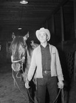 Grady Blue in the stables at the Southwestern Exposition and Fat Stock Show. He is standing beside and holding the reins of a saddled horse (left). Mr. Blue is wearing a cowboy hat, a button-up shirt, coat, and jeans with a belt.