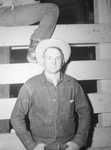 Attendees at the Southwestern Exposition and Fat Stock Show included Chuck Sheppard. He is shown standing in front of a wood rail fence, wearing a cowboy hat, a collared shirt, a coat and jeans. His thumbs are hooked in his jeans' front pockets. There is a man sitting on top of the fence (visible from the torso down).