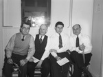 Red Cross Blood Donor Center. First-day donors: left to right, LeRoy Olmsted, Harold Foster, Rabbi Lipman and Raymond Cohn. Four men sitting on a bench waiting to give their second pint of blood.