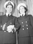 Lieutenant and Mrs. C. F. Johnson. She is the former Margaret Claire Winter. Lieutenant and Mrs. C. F. Johnson both wearing military uniforms with there arms entwined. They were married at St. Patrick's Catholic Church with Chaplain Raymond P. Doll of the Grand Prairie Naval Air Station officiating. Image appeared in the Star-Telegram Evening Edition March 21, 1944.