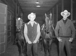 Jeff Slocum, left, and Ferd Slocum shown with their cutting horses. Jeff is wearing a cowboy hat, collared shirt, coat, bolo tie, and trousers. Ferd is wearing a cowboy hat, collared shirt, coat, and trousers. The men are standing next to their horses at the Southwestern Exposition and Fat Stock Show at Will Rogers Memorial Coliseum.