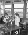Liberator Village Nursery School. Bill Goodrich and Rita Stallings inspect new canary in bird cage. Two children peering down at a small canary in a bird cage that sits on a table. Bill is holding a box of bird food.