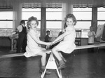 Liberator Village Nursery School. Carolyn, left, and Marilyn Blackman, twins, on sea-saw. Two small children on a sea-saw holding hands. There are additional children in the background.