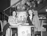 Mrs. Jimmy G. Lane, left, and Mrs. Chris Kauffman, staffing a War Fund booth at Wayside Inn. These women, wives of Captain Jimmy G. Lane of the 36th Air Division serving in Italy, and Major Chris Kaufman of the Air Force serving in Australia, are members of the Wives of Officers Club. Red Cross posters are in the background and foreground.