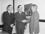 Ed G. Parker, right, congratulating B. W. Page, Texasteel personnel manager while his brother, Stafford Page, personnel manager of American Manufacturing Company looks on. Mr. Parker shakes Mr. Page's hand while his brother Stanford Page watches. Image appeared in Star-Telegram Evening Edition, March 23, 1944.