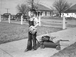 James Lemons, son of E. Lemons, pulling wagon loaded with items donated for auction at Saginaw School for the Red Cross War Fund. James Lemons is pulling a wagon with an over-sized baseball glove on his hand. Image appeared in the Star-Telegram Evening Edition March 23, 1944.