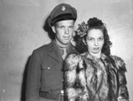 Private and Mrs. Carl V. Murray. She is the former Miss Clara Lee Michener and daughter of Mr. and Mrs. Roy E. Michener. The newlyweds are standing closely to each other. Private Murray is wearing a military uniform and Mrs. Murray is wearing a fur coat and a flower in her hair.