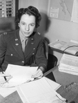 Captain Dorothy Harms of the Women's Army Corps. Captain Dorothy Harms sitting at a desk holding documents with a pen in her hand. Image appeared in the Star-Telegram Sunday Morning Edition, March 26, 1944.